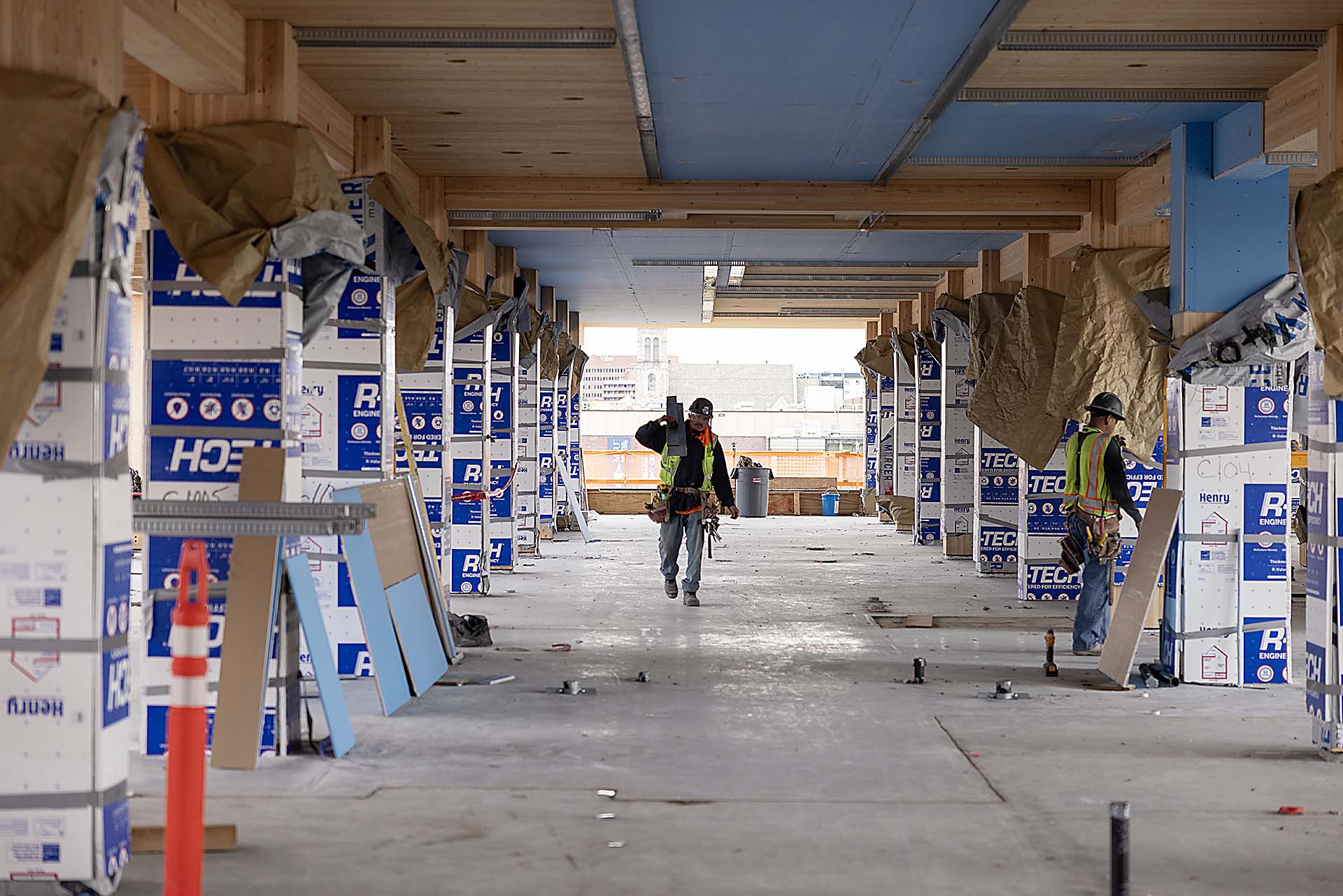 A worker carries materials on the fourth floor, which will be MSU Denver's new residence hall. Photo by Amanda Schwengel