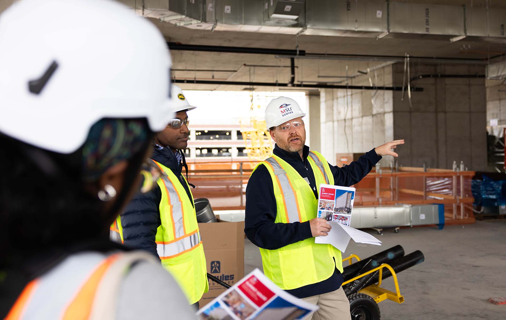 David McNabb, MSU Denver executive director of Housing and Residence Life, led the tourists, in hard hats and reflective vests, through the construction site, pointing out features like the sustainable mass timber being used in the project.